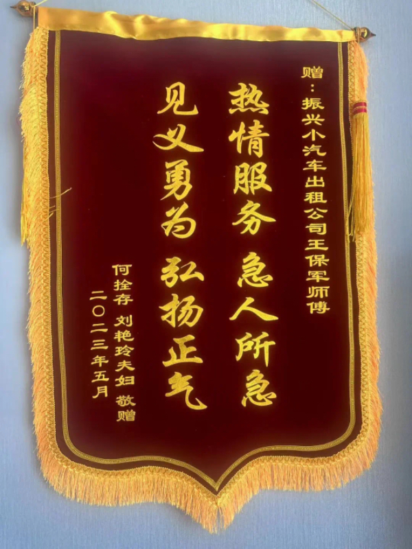 2023年5月23日,振興出租公司收到了何拴存、劉艷玲夫婦送來一面錦旗,贊許甘L82644車輛駕駛員王保軍師傅“熱情服務(wù) 急人所急 見義勇為 弘揚正氣”。